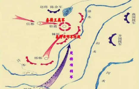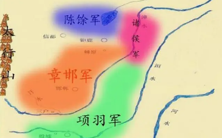 此后,赵王赵歇向各路诸侯求援,楚怀王熊心以卿子冠军宋义为主将,以项羽为副将,亚父范增为末将,率领六万楚军北上救援。项羽先夺宋义兵权,后“破釜沉舟”向秦军发动猛攻,王离统率的上郡边军就此被灭。