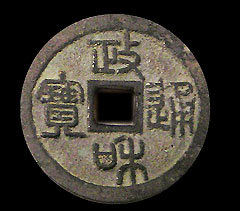 政和通宝宋哲宗去世后,因其无子,由其弟赵佶继位,是为宋徽宗。宋徽宗本人聪明绝顶,且多才多艺,书法、绘画、篆刻等皆精通。他在位二十五年,共出过七种钱,大都精美,为王莽以来所最为精致的钱品,也被称为古今第二铸钱高手。建中靖国元年(公元1101年)铸“圣宋元宝”和“圣宋通宝”铜、铁钱,圣宋元宝铜钱有小平、折二两种,皆篆、行成对;另一种隶书小平钱,书法清雅,乃徽宗御书。“圣宋通宝”铜钱,钱文行书,光背无文,传世较少。“圣宋元宝”铁钱有小平,但折二者较多,文篆、行成对,隶书者较甚少,有大钱,直径3.2厘米,钱背上月,应为当三或当五钱。“圣宋通宝”铁钱仅见小平一种,行书光背,较少较,颇名贵。崇宁年间(公元1102年-1106年)铸有“崇宁通宝”、“崇宁重宝”、“崇宁元宝”,都有御书体钱。大观元年(1107年)出“大观通宝”铜钱,为御书瘦金体钱。有小平、折二、当五、当十等。政和年间铸“政和通宝”,有小平、折二,文篆、隶成对,此钱版式较多。铁钱有“政和元宝”当三钱,钱文御书。“政和重宝”御书铜钱,甚罕见。政和钱、崇宁钱、大观钱很多铸成夹锡钱。所谓夹锡,即铜中夹有铅、锡的合成钱,是掠夺百姓财富的一种手段,以致社会动荡,民怨沸腾。后因徽宗再度改元重和,铸“重和通宝”小平铜钱,楷、篆成对,铸工较精良,铜料也纯足了,但不久又因更改年号而停铸了。宣和年间铸“宣和元宝”小平钱,有隶、篆两种,有多种版式,但存世较少。同时所出“宣和通宝”有小平、折二,有隶、篆两种,较罕见。(详见徽宗钱币介绍)