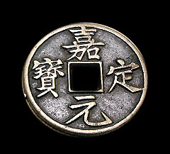 嘉定通宝(折十大钱)光宗绍熙年间(公元1190年-1194年)铸“绍熙元宝”,铜钱有小平、折二,背穿下纪年铁钱有小平、折二、当三;另有一种“绍熙通宝”铁钱,篆、楷成对。宁宗庆元年间(公元1195年-1200年)铸“庆元通宝”,有铜、铁两种,都有小平、折二、折三,背穿下纪年。铁钱背上有一纪监。嘉泰年间(公元1201年-1204年)铸“嘉泰通宝”铜钱,有小平、折二、折三,皆背穿上纪年。“嘉泰通宝”铁钱也有小平、折二两种;还有“嘉泰元宝”铜钱当五钱。开禧年间(公元1205年-1207年)铸“开禧通宝”,有铜、铁两种,制式同前。铁钱中有当三钱的“开禧元宝”。在开禧年间,南宋派兵北伐金国,战争开始后,宋军却连战连败,此时四川又发生叛乱,经济上受到严重的打击,最后屈服求和。到嘉定年间(公元1208年-1224年)又开始了经济上的通货膨胀,铸行了“嘉定通宝”铜钱和当五铁钱,和“嘉定元宝”铜、铁钱,铜钱有直径5.2厘米的折十大钱,此钱铸工颇精,较罕见;铁钱中有折三、折五,数量较多。此外还有一种“圣宋重宝”当五钱,书法精美,铸工颇精细,为南宋钱中的佼佼者。