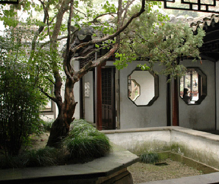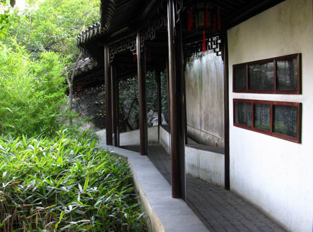 (3)景区之间以墙相隔,以廊贯通,又以空窗、漏窗、洞门使两边景色相互渗透,隔而不绝。框景、对景、漏景手法多变,全园曲廊贯穿,依势曲折,通幽渡壑,园内有蜿蜒高下的长廊670余米,漏窗200余孔。“之”字曲廊、空廊的应用与小天井的结合非常巧妙。利用空廊、小天井、漏窗、隔扇、洞门等形成富有变化的画面,用框景、对景、漏景等多种手法,来展示奇峰异石、名木佳卉。
