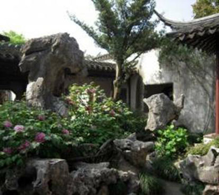 石林小院 揖峰轩 石林小院是位于五峰仙馆和冠云峰两宏敞庭园之间,以赏峰石取胜。清代乾嘉年间寒碧庄(即留园前身)主人刘恕酷爱峰石,但当时著名的瑞云峰已被移到了苏州织造署中,而冠云峰又尚在园外,“尝欲置庄中未果”,所以便把精心搜罗到的十二奇峰置于寒碧庄内,并自号“一十二峰啸客”;又请昆山人王学浩画了《寒碧庄十二峰图》,并有诗题(现藏上海博物馆)。后来又陆续得到了“晚翠”、“独秀”等五峰二石,于是在嘉庆十二年(1807)特意借用了宋代词人叶梦得在湖州的“石林精舍”的名字,建造了“石林小院”。“石林小院”由五峰仙馆东侧进“静中观”半亭的月洞门进入,全院由揖峰轩、石林小屋、回廊和花木点缀的晚翠、迎晖、段锦、竞爽等七个峰石庭园空间组成,布局灵巧,景观雅丽。