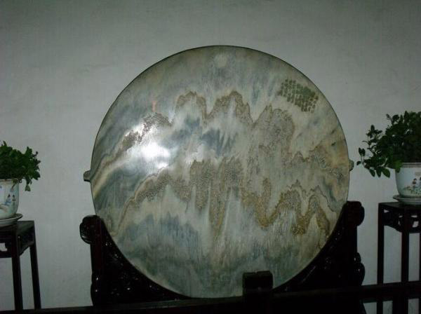 雨过天晴图 在留园五峰仙馆内,为大理石天然图画。石直径一米左右,厚度为15毫米,出产于云南点苍山山中。石表面中间部分隐隐约约群山环抱,悬壁重叠,下部流水潺潺,瀑布飞悬,上部流云婀娜,正中上方,一轮白白的圆斑,就像一轮太阳或者一轮明月,形成一幅自然山水画。图旁有梁谳集宋诗撰成的对联:“雨后静观山意思;风前闲看月精神。”出自北宋理学家邵雍的《安乐窝中酒一樽》。