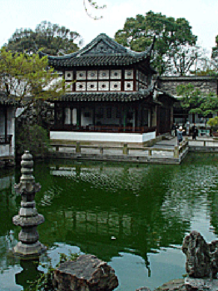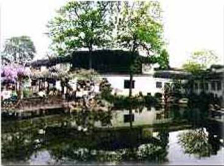 活泼泼地 西区一个可圈可点的景点。从假山廊向西南顺溪流南行,廊的尽头刻有“缘溪行”,取自陶渊明《桃花源记》中“缘溪行,忘路之远近。忽逢桃花林,夹岸数百步,中无杂树,芳草鲜美落英缤纷……”之意。“活泼泼地”位于溪水东北角,接近曲廊尽头,建筑为水阁形式,或称水榭。单檐歇山造,四面环有走廊。南边面临水面,其下凹入,宛如跨溪而立,令人有水流不尽之意。盛康时即有此阁。水阁取名于殷迈自励诗“窗外鸢鱼活泼,床头经典交加”。主人大概认为在山林野地中,就应该活泼泼地。此处傍山面水,环境相当清幽。阁内的陈设,以隐逸为主题,挂着四副图画,内容分别为林和靖放鹤、苏东坡种竹、周敦颐爱莲和倪云林洗桐。很显然,这就是整个西区要表达的内涵。阁内有钱泳撰写的一联:“青含长吉草;秀结富春华。”潘钟瑞撰活泼泼地联为:“水转桐溪约秋禊,路寻花步赋春游。”上联的秋禊指古人于夏历七月十四日临水祓祭,以清除不详,称为“秋禊”,以别于季春上巳的“春禊”。下联的花步源于留园别称“花步小筑”