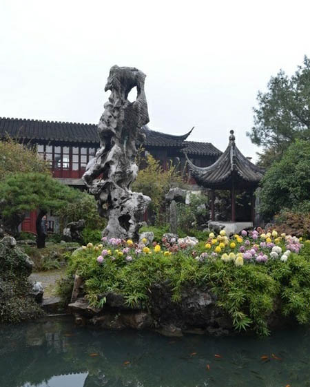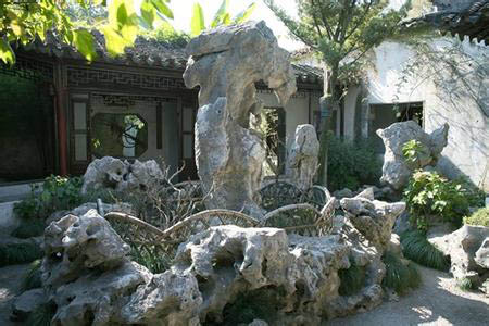 (1)特置石峰:园主刘恕酷爱奇石,多方搜寻,在园中聚太湖石十二峰,蔚为奇观,自号“一十二峰啸客”。后来又寻找到独秀、段锦、竞爽、迎辉、晚翠五峰,以及拂云、苍鳞两支松皮石笋,并称其院落为“石林小院”。因园主的癖好而造就了留园以特置石峰见长的特点,这些特置石峰与驳岸、花台等相互映衬,尤其是特置石峰的对景、漏窗和洞门对特置石峰的漏景和框景,应用非常广泛。