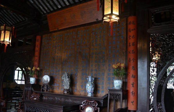 五峰仙馆 俗称“楠木殿”。“五峰”源于李白的诗句:“庐山东南五老峰,晴天削出金芙蓉”。楠木殿厅堂面阔五间,中间用纱隔屏风隔出前后两厅。其中前厅约占了整个建筑的三分之二的面积。正厅中间朝南设供桌、天然几、太师椅等家具,左右两边分设几、椅。众多家具将正厅空间分隔成为明间、次间和梢间等空间系列,这样的空间分布较一般的江南厅堂更加错综复杂,典雅繁美。仙馆东西墙上分别设了一列开合非常大,但是装饰却简洁精雅的窗户。这样的做法是要把窗户外的两个小庭院的风景借鉴进来,拓展厅堂的视觉空间,保证建筑中有充分的光线,显得宽敞明亮,宏丽而大气。厅内有薛时雨集园主盛宣怀句撰成的五峰仙馆对联:“迤逦出金阊,看青萝织屋,乔木干霄。好楼台旧址重新,尽堪邀子敬重游、元之醉饮;经营参画稿,邻郭外枫江、城中花坞。倚琴樽古怀高寄,犹想见寒山诗客、吴会才人”。上联中的“子敬”是晋王羲之第七子王献之的字,他少有盛名,高迈不羁,书法和王羲之并称。他清高的游赏,也是无拘无束。《世说新语·简傲>篇说“王子敬自会稽经吴,闻顾辟疆有名园,先不识主人,径往其家。”就是他的风范和品格。“元之”是宋代王禹偁的字。王禹偁是宋太宗太平兴国八年进士,官右拾遗,翰林学士。因刚直敢言,屡遭贬谪。雍熙元年曾知长洲县。王禹偁在没有得到功名之前,曾发出“他年我若功成后,乞取南园作醉乡”的话。下联中的枫江指运河流经枫桥、江桥附近的一段河道。花坞指桃花坞,在阊门内,有唐寅故居。“寒山诗客”指张继,有《枫桥夜泊》诗。吴会才人指唐寅,吴县人。此联叙事中寓抒情,叙留园地理位置、巧构佳筑。园归盛宣怀以后,盛宣怀吸取苏州诸园之长,重加扩建,所以建筑布局在苏州诸园中首屈一指:既可宴客聚友、读书养性,也能清寒避暑、游息娱乐。北厅有陆润庠撰写的一幅长联:“读书取正,读易取变,读骚取幽,读庄取达,读汉文取坚,最有味卷中岁月;与菊同野,与梅同疏,与莲同洁,与兰同芳,与海棠同韵,定自称花里神仙。”
