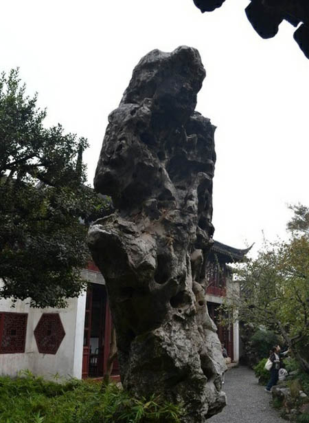 冠云峰 冠云峰位于留园东部,林泉耆硕之馆以北,因其形又名观音峰,是苏州园林中著名的庭院置石之一,乃太湖石中绝品,相传这块奇石是宋徽宗花石纲中的遗物。宋徽宗为在东京城内建造“延福宫”、“万寿山”,下令在全国范围内征集奇花异石。崇宁(1105)四年特地在苏州设立了苏杭应奉局,专门负责搜罗名花奇石。“冠云峰”即为苏杭应奉局主管朱勔所罗致。由于北宋为金所灭,徽宗自己也做了俘虏。冠云峰就成为未来得及运的花石纲的遗物。