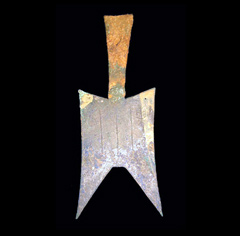 (耸肩尖足空首布)“空首布”大致分为三种:1.耸肩尖足空首布:指布币的两肩向上耸起,并与币身中线成一定的斜角,尖足指裤足下端尖锐,它的头部又有一个空腔,所以叫“耸肩尖足空首布”。可分为两种:大型耸肩尖足空首布和小型耸肩尖足空首布,大型的其特征:空首、长銎、銎有穿孔、因銎有范塞而不透,耸肩、尖足,背有三条竖纹,体形薄而博大,长约16厘米左右,肩距6厘米左右,厚约0.07—0.1厘米,一般重35.3—37克,绝大多数无文字,所以旧谱称为“无文大布”。小型耸肩尖足空首布,形状与大型相同,长约11.7—12.5厘米,肩距4.7—5.3厘米、厚约0.05厘米,重约25.3—30.7克,面无直纹,背平素,颇为罕见。