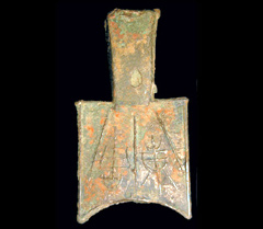 (平肩弧足空首布)2.平肩弧足空首布:平肩又称“方肩”指布币的两肩为平直状,弧足指布币下端呈圆弧状,所以叫“平肩弧足空首布”。一般分为大型和小型两种。大型的特点为:空首、平肩、弧足、长銎、銎有孔,面背均有三直纹,长约8—10厘米、足宽4.6—5.3厘米、厚0.1—0.12 厘米、重约33.1—44克,多数重量在39克左右,钱文多为一字个别的有两字或四字,多半是地名。小型的特征形状与大型的相同,长约6.3—7.4厘米,足距3.7—4.3厘米,厚0.08—0.10厘米,重约18克左右,其文字已发现并著录的有:东周、安周、安臧、邵丘等十种。