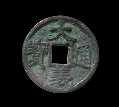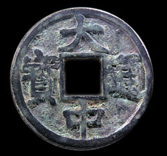 大中通宝是朱元璋在称吴国公时所铸。当时朱元璋一路取金陵,得皖南等地,并有江西、浙江等地,东南局势渐稳,遂于金陵设宝源局,铸大中通宝。大中通宝分五等,有小平、折二、折三、当五及当十。明朝建立以后,仍铸行大中通宝钱,背文加铸。“北平”、“福”等地名,但已不能算元末起义军钱币了。金陵所铸大中钱皆光背无文,仅当十钱背穿上置“十”字,钱文楷书顺读,书法端正,制作较精良。 (沙朝振)