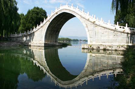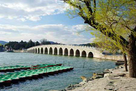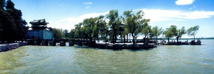 (5)绣漪桥 位于昆明湖南端与长河的交汇处,始建于乾隆年间,是东堤与西堤的分界点。绣漪桥在清漪园时是一座水门,是经长河入园的必经之地。绣漪桥的形状与西堤上的玉带桥相似,桥东、西向坐落,汉白玉单拱桥身,高约9米,有60个望柱,62块栏板,单侧有43级青石台阶,是园中最高的桥梁。绣漪桥北侧有昆仑石碑一座。绣漪桥于乾隆二十四年(1759年)即已建成,桥外原有水闸,由于湖水水位高于河水,闸门开时湖水急流而入长河,故每次御舟入园都需纤夫将其牵入湖中。光绪十七年(1891年)在其南添建石平桥,桥西添修3孔涵洞。1993年,将绣漪桥闸南移。桥西新建一座六脊攒尖圆亭。桥南有颐和园的南如意门。昆明湖南端绣漪桥