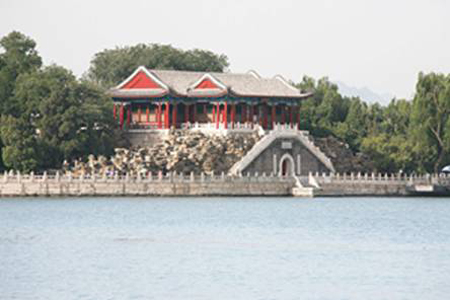 (4)凤凰墩 位于昆明湖南端,与南湖岛遥对,是一座圆形的小岛。乾隆时期岛上建有2层楼式建筑会波楼,楼顶上装有一只镀金的铜凤凰,铜凤凰长约3米,口中衔着一面凤凰式风旗,腹内中空,设有可以旋转的机关。铜凤随风力的大小而旋转,从其旋转的速度可以判断风力的大小。道光年间,会波楼被拆除。光绪年间在岛上建有小亭,后毁坏。1955年在凤凰墩岛上重建小亭。