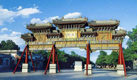涵虚牌楼 涵虚牌楼耸立在东宫门外,是一座三门四柱七楼的木构大牌楼。牌楼东西向坐落,庑殿歇山顶,前后檐有龙凤透雕花板。东面额曰“涵虚”,西面额曰“罨秀”,巧妙地点出了颐和园清幽恬静、山青水秀的主题,可以视为是颐和园山水乐章的“序曲”。涵虚牌楼是从东面进入颐和园的第一座建筑,从圆明园一路行来,远远就可看到它的形象,而当近到它的眼前,万寿山佛香阁的景致正处在牌楼柱枋构成的画框之内,颐和园这一精美绝伦的巨幅画卷由此缓缓展现在人们的面前。