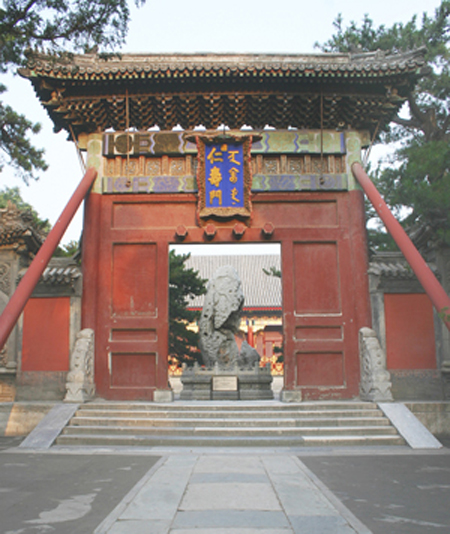 仁寿门 仁寿门在清漪园时称二宫门,重建后称仁寿门,是从东宫门入园的第二道宫门。仁寿门是牌楼门、衙署仪门与寺庙棂星门相结合的形式,柱高6.14米。牌楼为2柱一楼,庑殿式顶。门上悬满汉文“仁寿门”额。仁寿门的左、右各有一个长7.2米青砖影壁,庑殿式顶,上有砖雕浮龙,是颐和园内惟一的一座砖雕影壁。影壁与红墙连接,左右各有一个小随墙门。