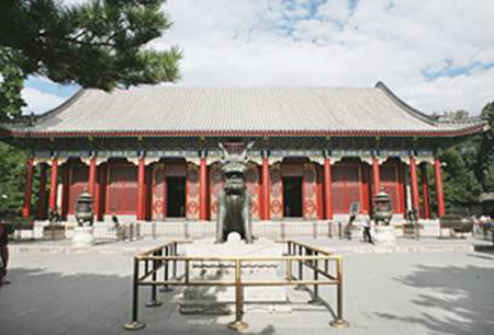 仁寿殿 始建于乾隆年间,原名勤政殿,光绪时重修,并引孔子《论语》中“仁者寿”的语意改为今名。仁寿殿在仁寿门内庭院的正中前面有一块巨大的湖石作为屏障。两侧为面阔5间的南、北配殿,配殿后有后罩房。仁寿殿前的露台上,陈列着4只乾隆年间铸造的铜鼎炉,及铜龙、铜凤、铜缸各1对,上面有“天地一家春”的款识。院中还有一只造型怪异的铜麒麟。大殿面阔7间,进深5间,周围有廊,柱高5.53米。歇山式屋顶,明间外檐柱间悬挂用满、汉2种文字书写的匾额“仁寿殿”。殿内明间正中有地平床,设象征封建皇权的九龙宝座,上方悬挂匾额“寿协仁符”,配以楹联“星朗紫宸明辉腾北斗,日临黄道暖景测南荣”,既是帝王自勉,也是歌颂帝业的辉煌。另外,殿内还有10余块单匾,其内容有称颂帝业的,象“大圆宝镜”“景星朗耀”“海涵春育”“濊泽旁敷”“德风惠露”“春晖承暄”;有帝王自勉的,如“无暑清凉”;有吉祥祝福的,“安乐延年”“寿恺禔康”;有赞美景色的“碧岫晴烟”等等。原勤政殿内还有两幅表明帝王理政准则和方针的楹联,“念切者丰年为瑞贤臣为宝,心游乎道德之渊仁义之林”和“义制事礼制心检身若不及,德懋官功懋赏立政惟其人”,这两联与原殿名是非常契合的。