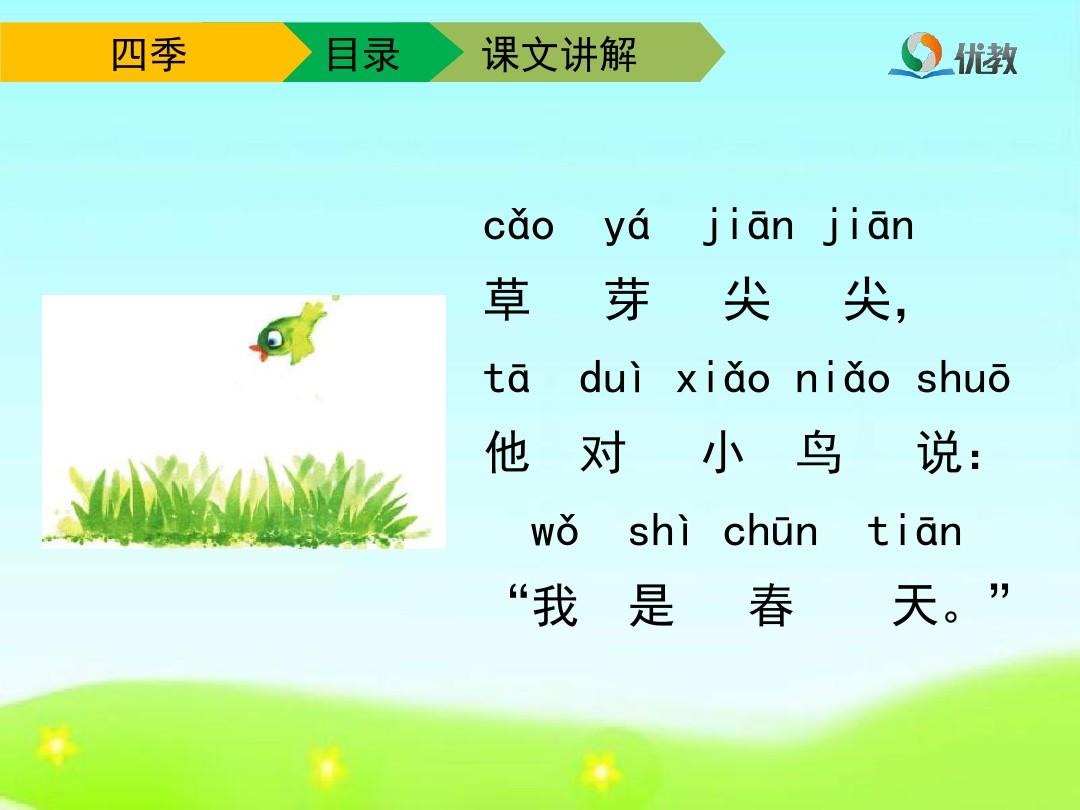 一年有四个季节春夏秋冬,各季的景*都不同 春天来了,嫩绿的小草悄悄地钻出了地面,给大地披上了绿*的新装柳树绿了,它垂下那柔软如丝的秀发,在春风中摇。小学一年级的语句以短句为主 侧重观察,简短表达,有一定的观察顺序 适当运用比喻,就可以了秋天来临了天空像一块覆盖大地的蓝宝石 村外那个小池塘,睁着碧澄澄的。