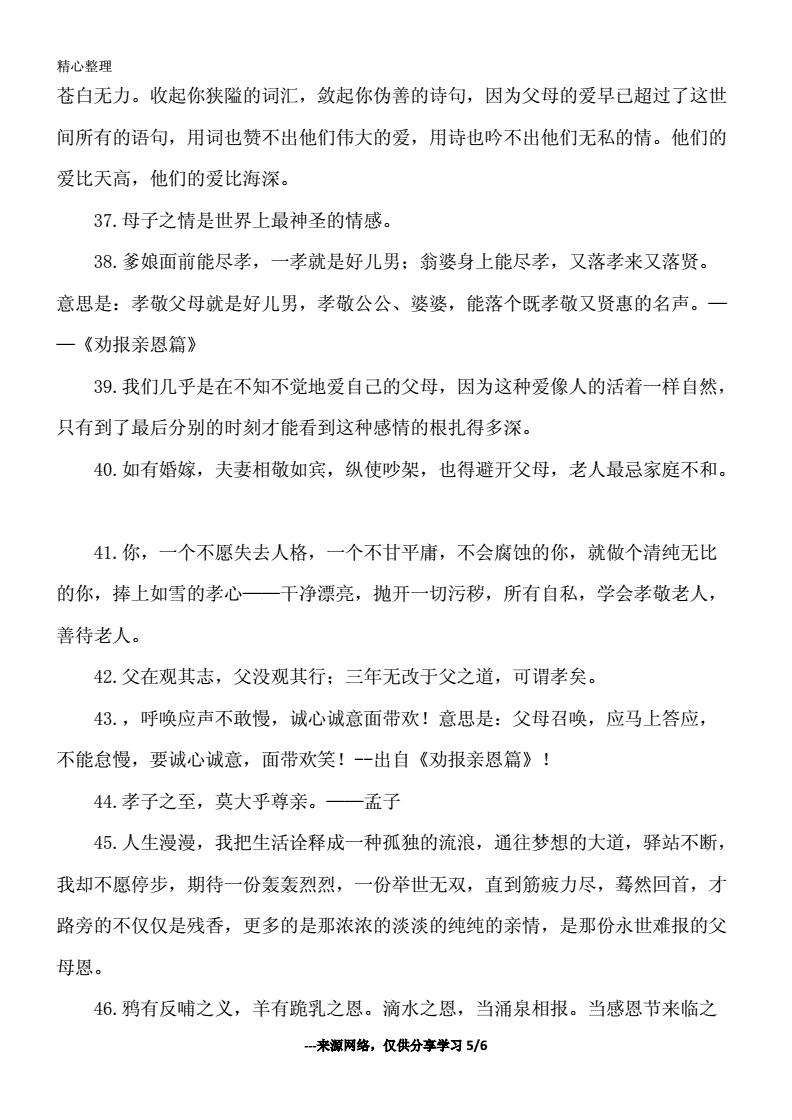 28父亲的爱是挂满眼角的微笑,生活的重担压不弯父亲的脊梁,再苦再累也要托起明天的太阳 29父母,我感激你们的养育之恩,我会知恩图报学好本。就算不能寄些钱来孝顺父母,那也要从感情和精神上来孝顺父母句子 43在孩子的心中,母亲就是上帝 44仁之实,事亲是也义之实,从兄是也 45。