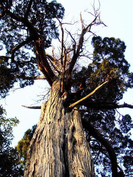 三皇殿内亦有一株古柏,高22米,胸围近4米,树龄2100年,与三官殿大门外的古柏同是西汉张廉夫初创太清宫时所植。这就是太清宫内最奇特的是“汉柏凌霄”和“三树一体”。所谓“汉柏凌霄”,是指这株汉柏上缠绕着如龙蛇状的凌霄藤,汉柏枝干挺直,树皮斑驳,中间的一些小枝干也已枯死,唯有顶端的柏叶仍绿意盎然,那凌霄的藤蔓借着这挺直之干攀缘上升,在一树苍老中开出明艳的凌霄花。在这“汉柏凌霄”的奇观中,更令人称奇的是,在树的另一侧又生出了一棵盐肤木(又名五倍子),因而被称为“三树一体”。2003年,这株五倍子被一场大风刮下,今已不存,但不久后在这棵树的树杈上又生出了一棵刺楸,继续保持着“三树一体”的奇观。凌霄的树龄已超过100年,盐肤木的树龄也快100年了。近百年来,三树一体同生,在植物界实属罕见。