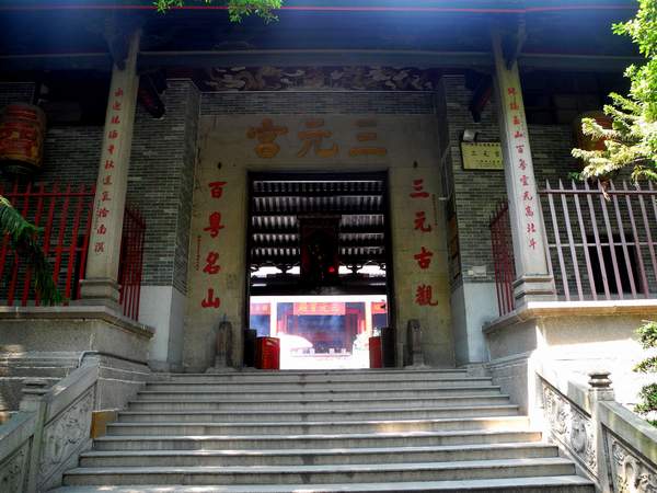 登上40余级石阶可达山门。山门面阔5间,进深3间,山门正上方有“三元宫”三个大字,门两旁的石刻对联是“三元古观,百粤名山”,笔法洒脱雄浑。门前立着一对巨大的石狮。