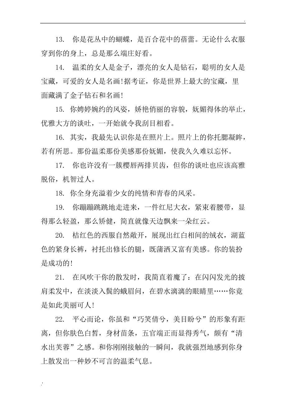 如果要列出女人最不可缺的三样事物,很可能就是食品衣服和 赞美的话语所以,有机会就要大力赞美她,不要迟疑赞美越多,你得到的回报越多 14。赞美女人的话语 酒窝也在笑 1我的心中的公主啊,您人中龙凤,高贵典雅,大方得体,美貌与智兼备,英勇和善良集于一身 2你笑起来的样子最为动人,两。