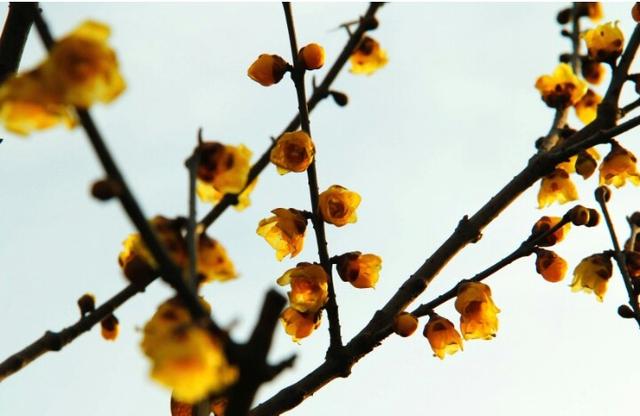 3.褐色的枝干长满了腊梅花,犹如上了腊一样晶莹剔透闪闪发亮,也有少部分黄色的花骨朵正将开放。每朵腊梅花有五片花瓣,分里外二层,外层的花瓣是浅黄色的,里面的花蕊是金黄色的,它们层叠分明,十分引人眼目又招人喜欢。
