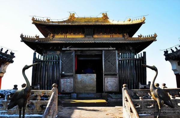 位于海拔1612米武当山主峰天柱峰的顶端崇台之上,为铜铸成,实际上是铜殿。由于战争与人为破坏,中国现存的铜殿仅有5处6座。其中以五台山显通寺铜殿、昆明北鸣凤山上铜殿和武当山铜殿最为著名。