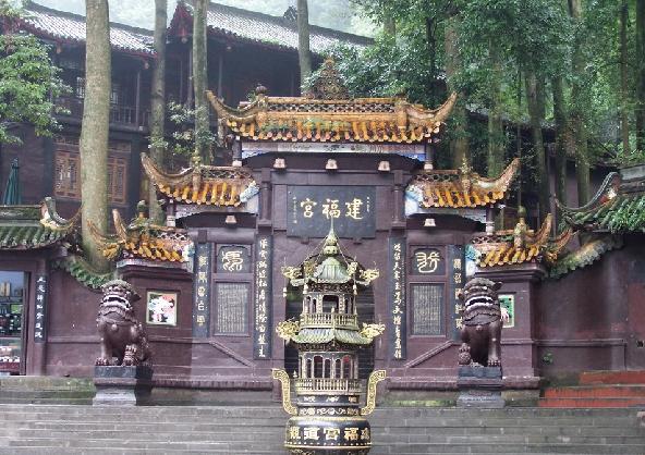 建福宫坐落于青城山丈人峰下,今青城山山门前左侧,是青城著名的道教宫观,也是游览青城山的起点。因传为五岳丈人宁封子修道处,所以唐代开元十二年(724)创建时名丈人观,宋代改名“会庆建福宫”至今。