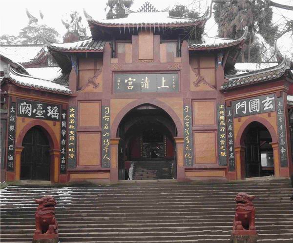 上清宫坐落在青城第一峰,始建于晋代,现存庙宇为清朝同治年间所建。现有老君殿、三清殿、道德经堂、文武殿和玉皇殿。宫门为石砌券洞,上有门楼,“上清宫”匾额为蒋介石1940年手书。