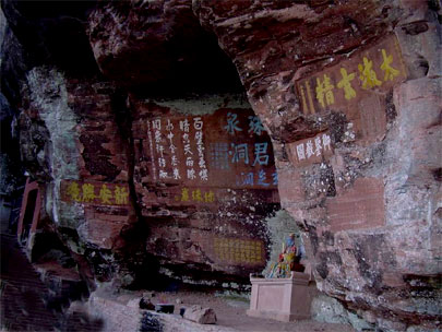 天师洞又称常道观,是青城山最主要的道观,1983年,被国务院确定为全国重点道教宫观。相传东汉末年,天师道创始人张道陵曾在青城山山腰第三混元顶峭壁间修炼布道,俗称天师洞。原观早毁,清代重建,有殿三重,名三清殿、三皇殿和黄帝祠。三清殿是主殿,建于1923年,是一座重檐歇山顶楼阁式建筑。殿前铺设通廊石阶9级,前檐排列大石圆柱6根,殿堂横列5间,正中高悬清朝康熙皇帝的御书匾额:“丹台碧洞”。殿前高悬几副对联,其中一幅写道:“一生二,二生三,三生万物;地法天,天法道,道法自然”。此联既深得老子道家思想的真传,又暗含“一气化三清”的深刻寓意。三清殿中供奉的是道教至高无上的三位尊神,即居于玉清仙境的元始天尊,居于上清仙境的灵宝天尊,居于太清仙境的道德天尊。道教认为,这三位尊神正是天下万事万物的创造者。