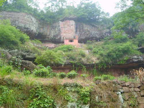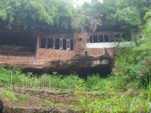 所谓楼上楼下即悬崖底部鑿有上下两洞,当年有8个道士住在洞内避世修炼。。距楼上楼不远处有“仙人挂画”一景。它是一块平展的崖壁,高约2米,壁面色彩斑斓,溪水成瀑自壁两边流过,形成天然石画。