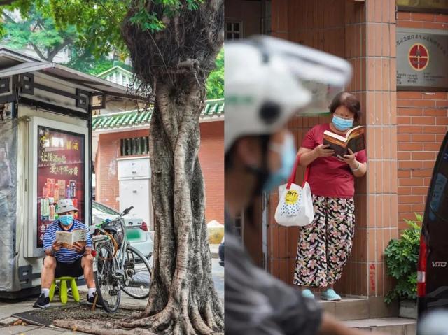 这些插画里主人公的故事都是现实里真实发生的事,比如等待孙子孙女放学间隙,穿着朴素,戴着口罩淡定看书的阿伯阿婆: