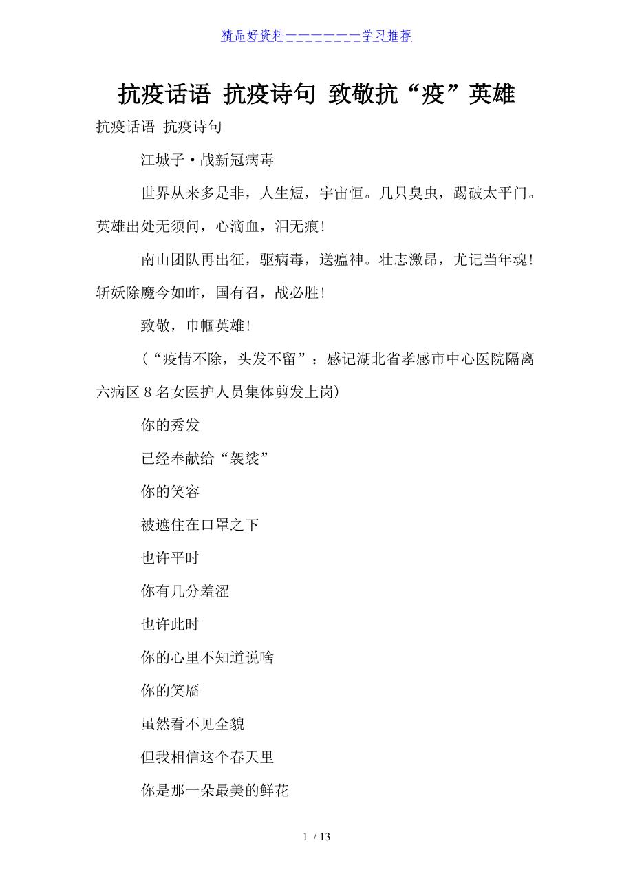 希望病毒早点消失,希望逝者安息,希望世界依旧温暖,希望平凡的日子可以重来下面是小编收集整理的致敬抗疫英雄的话语,欢迎阅读参考致敬抗疫英雄。简介 写写帮文库小编为你整理了这篇致敬抗疫英雄的句子,但愿对你工作学习有帮助,当然你在写写帮文库还可以找到更多致敬抗疫英雄的句子 致。