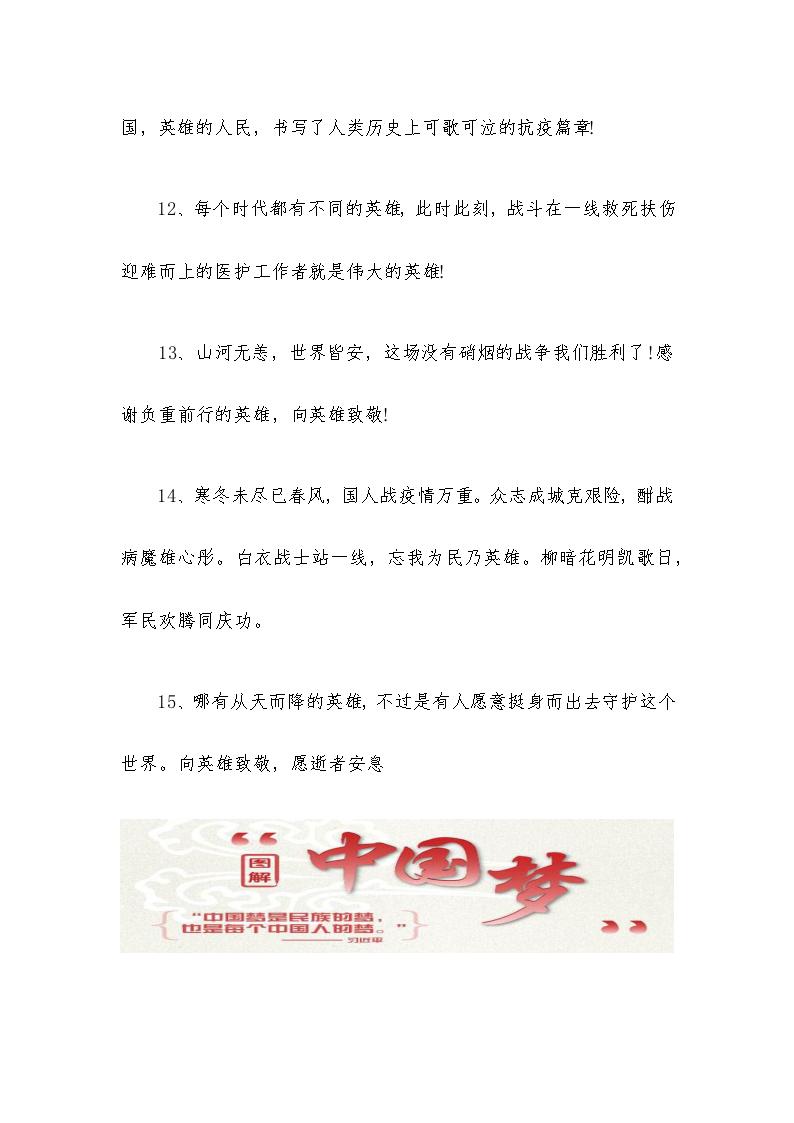 18抗击疫情没有生而英勇,只是选择无畏,致敬英雄! 19向逝者默哀!为生者祈福!向英雄致敬!愿国泰民安!英雄的祖国,英雄的人民,书写了人类历史上可歌可泣的抗疫。阖家团聚时刻,瞒着亲人冲上一线的医务人员迅速集结,第一时间赶赴前线的援鄂医疗队员直面病毒,坚守在战“疫”最前沿的“白衣天使”这些与时间赛跑跟病毒搏击的勇。33少年强则国家强! 向英雄致敬!向逝者致哀! 34愿逝者安息,英雄不朽,精神长存,致敬英雄 35向英雄致敬,一路走好逝者安息精神长存 以上就是带给大家。