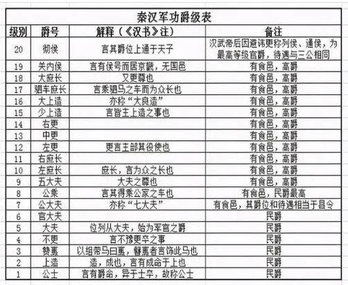 按照商鞅改革后的这套制度,秦国的爵位分为二十个等级,分别为:分别为:一级公士,二上造,三簪袅,四不更,五大夫,六官大夫,七公大夫,八公乘,九五大夫,十左庶长,十一右庶长,十二左更,十三中更,十四右更,十五少上造,十六大上造,十七驷车庶长,十八大庶长,十九关内侯,二十彻侯。