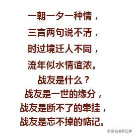 3、战友情!就像一壶陈年的老酒,年代越久情越浓。虽然天各一方,但割不断彼此的牵挂和关怀。曾经朝夕相处,同甘共苦,胜过手足亲情。无论走到天涯海角,总会想起战友的身影;无论遇到何等困境,身边总会有战友的真情。