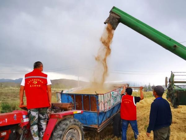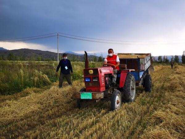 在乌鲁木齐县板房沟镇合胜村,收割机械正在麦田里来回穿梭,乌鲁木齐县教育局驻村工作队结合疫情防控工作要求,组织志愿服务队,帮助农牧民有序开展农作物收割、晾晒等工作。