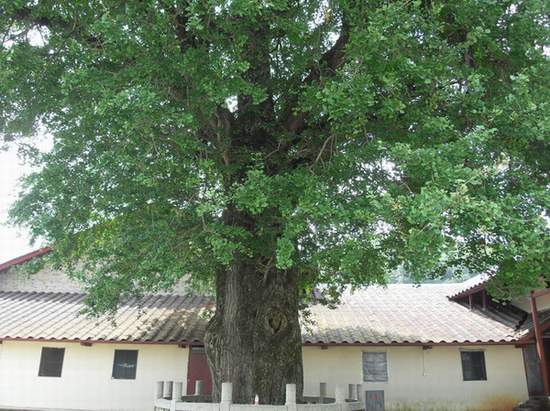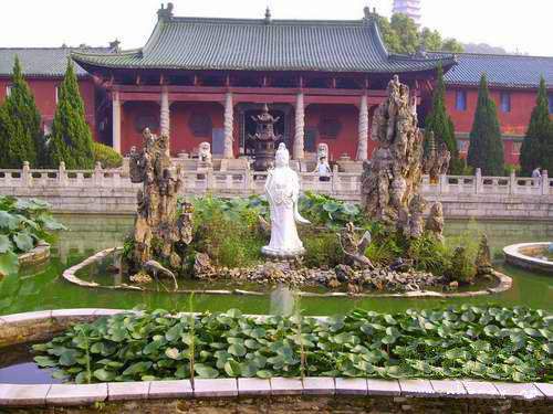过虎溪桥,北行约百余米为东林寺的第一道山门,门墙书有“秀辑庐峰”四个篆体大字,山门上竖挂着“晋建东林寺”石刻。跨进第一道山门有一条南北伸展的石砌甬道,甬道东侧屹立着一棵苍劲挺拔,形如圆盖的古松一棵,虬枝盘结、树影婆娑。此松为慧远大师亲手所植,本名为“罗汉松”,因植于东晋,已有1600多年历史,故称“六朝松”,有人亦将它誉为“庐山第一松”。据说此松颇具灵性,几度枯荣皆与东林兴衰息息相关:寺兴树则荣,寺衰树则枯。古松旁为护法殿, 正中盘坐着大肚弥勒佛,其后立着韦陀佛。发挥?护法殿之后,即 “白莲池”。