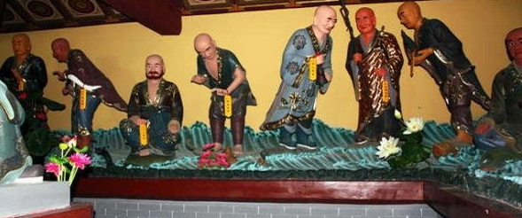 1987年东林寺全面复修时移建于此,堂内东西两壁嵌有刘程之、雷次示、高僧慧远、梵僧佛驮跋陀罗等“十八高贤”石刻像。雕塑精细,形象逼真,个性鲜明,神态各异,栩栩如生。对白莲社和十八高贤,历代皆有咏歌,也成为东林寺独有的文化景观,如唐代释怀悟《莲社图云:“晋室凌夷帝纪侵,群英会集匡山阴。楼烦尖师挥麈尾,十八高贤争扣几。才高孰谓人中龙,反使伊人思谢公。烟飞露滴玉池空,雪莲蘸影摇秋风”。宋代江西派始祖黄庭坚也到过东林寺,盛赞白莲社和寺中白莲,写诗二首,其一云:“白莲种山净无尘,千古风流社里人。禅律定知谁束缚,过溪沽酒见天真”。其二云:胜地东林十八公,庐山千古一清风渊明岂是难拘束,正与白莲出处同。(《东林寺二首》)