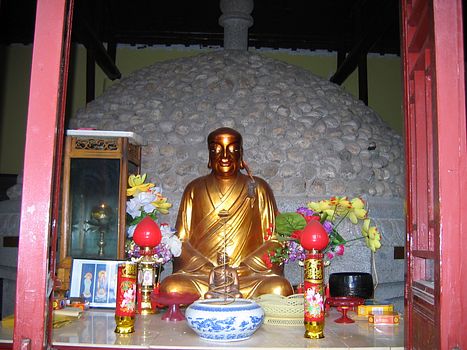 在“藏经楼”后,是东晋时佛驮跋陀罗尊者在东林寺翻译经典之处。尊者佛驮跋陀罗(法号“觉贤”),姓释迦,迦维罗卫国人,甘露饭王之苗裔。早年父母双亡,出家为沙弥。年十六,博学群经,深达禅、律。在罽宾国僧人伽达多共同研修大乘经典。罽宾为古代中东东北部的一个国名。位于兴都库什山南麓,扼守大夏通往喀而尔、克什米尔和印度的大道的咽喉,是古代中东及印度西北的交通和战略要地。听说鸠摩罗什大师在长安,遂由罽宾即往从之。东晋义熙十四年(418),吴郡内史孟顗、右卫将军褚叔度,将佛驮跋陀罗迎到东林寺主持佛经翻译,法业、慧义、惠严、慧观等协助笔录师先后译出《观佛三昧经》、《般泥洹经》、《修行方便论》,及法显所得《大僧只律》,凡十五部。宋元嘉六年(429),念佛而化,塔于庐山北岭。