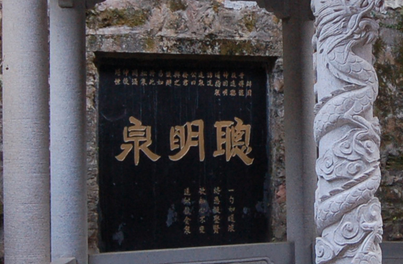 一泓清泉在玉佛殿后,是慧远与其好友南朝名士殷仲堪经常一起研究“易经”、谈天论教之处。据《高僧传》:“东晋名士殷仲堪来东林寺拜访慧远大师,二人行至山脚,见此处苍松翠柏,泉水潺潺,就于此听泉谈《易》,殷将军博学多才,能言善辩,慧远大师指泉赞道:‘将军之辩,如此泉涌,君侯聪明,若斯泉矣!’”唐太宗亲题“聪明泉”三字。晚唐诗人皮日休亦有诗云:“一勺如琼液,将愚拟圣贤。欲知心不变,还似饮贪泉”。
