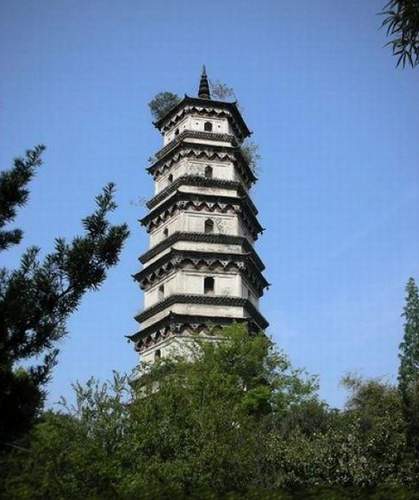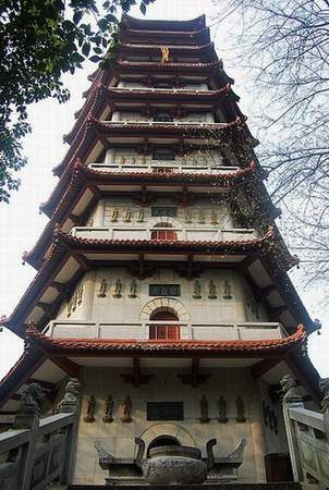 又名上方塔、舍利塔,为天竺高僧佛驮跋陀罗禅师所立。该塔六面七级,雄伟高耸。塔身嵌有众多佛像,每层亦供奉有佛像。佛驮跋陀罗禅师从西域带来的数颗“释迦牟尼佛舍利”即葬于此。古塔几经兴废,今塔为1998年重修。