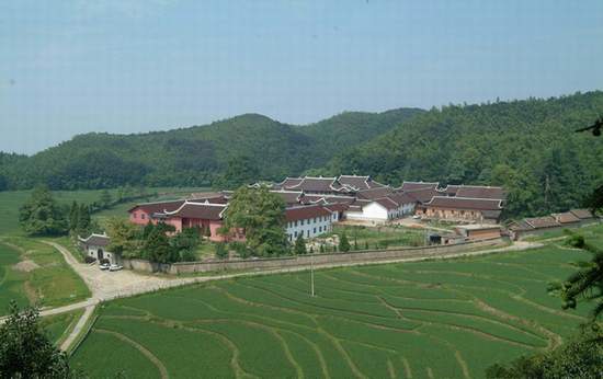 真如寺则坐落在群山环抱的一片盆地中,周围群峰环绕,状如莲瓣攒簇,形成“莲峰簇簇绕华台,一钵中央倚镜开。对寺面看云捧出,当湖直逼海浮来”的美妙画图。中间一片平坦开阔之地,有良田,有湖泊,有小溪,有水坝,环山是修林茂竹,绿荫覆盖,真是一个人间仙境。登上云居山顶,一泓湖水,长平如镜,拱卫寺门,湖形似月,纹名明月湖。每当红曰初升,金光荡漾,寺殿生辉;入夜皓月当空,满湖明月,映出莲城古寺影像,显得无比恬静!寺僧元凤曾说:“澄湖高涌乱峰头,照澈睛空古镜湖;天上云居真绝景,一泓收尽万山秋。”