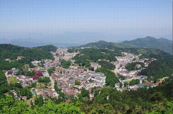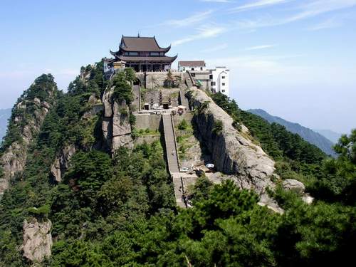 九华山在安徽青阳县境内,东与太平湖毗邻,南与黄山接壤,总面积为120平方公里。共有99座山峰,以天台、十王、莲华、天柱等9峰最雄伟。九华山是国家级风景名胜区,为全国“一庄(承德避暑山庄)一河(北戴河)十四山”的避暑胜地之一。九华山原名九子山。椐《太平御览•九华山录》:因“此山奇秀,高出云表,峰峦异状,其数有九,故号九子山焉”。九子山改名九华山,与唐代大诗人李白有关。唐玄宗天宝十三年(754),李白去江汉访道途中,在青阳县令韦权舆处作客,憩于九华山下夏侯回之堂,见此山“高数千丈,上有九峰如莲花”,而九子山之名,又“按图征名,无所依据”,于是改名为“九华山”以“传之将来”。并与韦权舆、高霁等作《改九子山为九华山联句》以记其事。诗中称此山是“妙有分二气,灵山开九华。”并追羡其中“青荧玉树色,飘渺羽人家”的仙境。两年后,李白在写赠韦仲堪的诗中,对九华山仍留恋、赞叹不已:“昔在九江上,遥望九华峰。银河浮绿水,绣出九芙蓉”。名山经过名人题名,更加以名诗播扬,就更加声名远播。