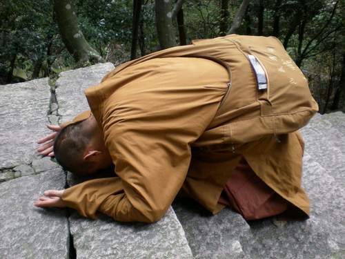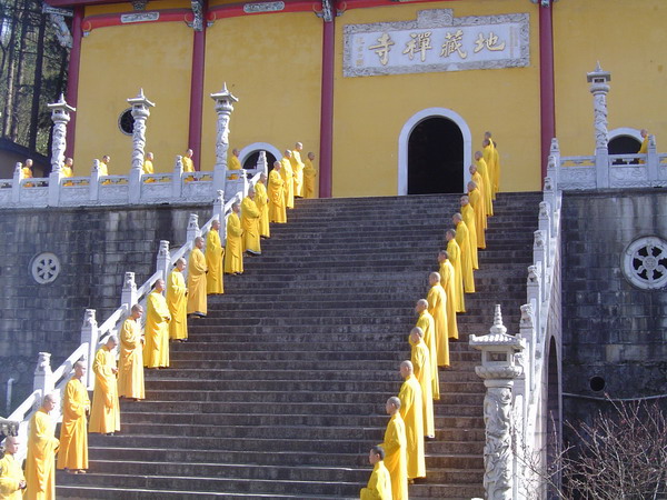 九华法会上三跪九扣前往肉身殿朝拜金地藏的僧人