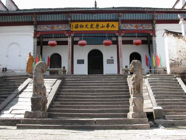 九华山化城寺为东晋隆安五年(四○一年)高僧杯度始建,旧志云:晋隆安五年(401)天竺僧杯渡始创寺,曰‘九华’。唐郡守张严(岩)奏额始名‘化城’。”唐人费冠卿《九华山化城寺记》载,唐开元末有僧人檀号居此,寺额即曰“化城”;至德初年,青阳诸葛节等发现正在东岩石室苦修的新罗僧地藏,深为感动,于是买下檀公寺基,构筑台殿,以成琳宇,请地藏大师居之;建中初年,池州刺史张岩奏请朝廷移旧额置于新寺,于是化城寺成为地藏大师传经布道的大伽蓝。贞元十年(794)大师圆寂,被僧众视为地藏菩萨灵迹示现,从此九华山逐渐成为闻名海内外的地藏道场。化城寺历经兴废,但代有名僧、官府和乡民的护持,一直位居九华诸寺的中心地位。唐代诗僧应物、冷然等留有吟咏化城寺莲宫胜境的诗篇。明洪武二十四年(1391)住持僧宗琳重建殿宇、廊庑、禅堂、斋僧、养老、学事、净业诸堂,并建土库、方太寮,使化城寺成为九华山总丛林。乾隆三十一年(1766)派钦差朝山进香并赐御书《芬陀普教》。此时化城寺东西两序(亦称二宫)七十二寮房已具规模。据清周赟《九华山志•化城寺僧寮图记》载:“天下佛寺之盛,千僧极矣。乃九华化城寺,当承平时,寺僧且三四千人。寺不能容,则分东西两序;又不能容,各分十余寮至六七十寮之多。化城寺遂成为“九华诸寺之冠”,“香火之盛甲于天下”。咸丰七年(1857)全寺几毁于太平天国之兵火,仅存藏经楼。1914年成立青阳县九华山佛教会,会址设在化城寺。1926年住持僧镇安。1929年住持僧容虚在此创办“江南九华佛学院”。1942年住持僧智云。1949年住持僧悟月。1958年青阳县人民政府重修。1968年全寺佛像因文化大革命而毁。1981年九华山管理处重修化城寺,辟为“九华山历史文物馆”。1981年9月安徽省人民政府公布化城寺为重点文物保护单位,1983年4月国务院公布化城寺为汉族地区佛教全国重点寺院(含肉身殿等9座寺院)。