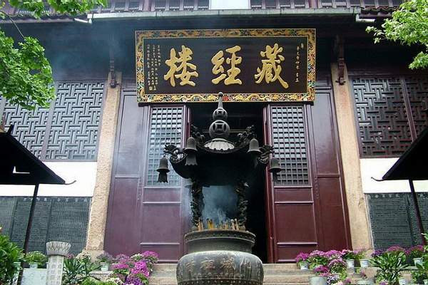 大殿后进为明代建筑藏经楼。楼殿之间是一个小院。院内东西两壁上,嵌有十四方碑刻,其中明刻碑记三方,清康熙等年间刻碑十一方。值得注意的是几方《严禁弊害碑》,刻于明末清初。是当时政府对僧徒的法律要求,具有较高文献价值。藏经楼高二层,底层前檐向前延伸三米多。藏经楼与楼前三进殿宇原为明代同时建造,清代遭兵燹,三进殿宇尽遭焚毁,惟藏经楼安然无恙现为佛教文物展览馆,藏有明神宗颁经圣谕,御赐藏经一部共六千七百七十七卷,这部明版大藏经,极为珍贵。另有明代高僧海玉(字无瑕)手书《血经》81卷、印度贝叶经2札以及清康熙、乾隆帝的御书手迹、地藏的九龙方印以及其他佛教文物共一千三百余件。