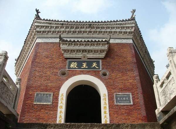 登上通天阶最后一级石阶,迎面即是天王殿,是供奉弥勒佛和四大天王及韦驮塑像的殿堂。天王殿纯砖无梁结构,攒尖6角,内穹无梁,亦称“六角无梁殿”。顶高12米,檐高8米,东西跨度与南北进深均8米。顶端有一盖式“法轮”笼罩其上,与穹顶相扣而不相接,使殿顶保持良好的通风和透光效果。殿门楣上,嵌有水泥磨砂“天王殿”黑底金字匾额一方。殿门东墙壁,嵌镶国务院于1983年4月9日批准的“全国重点寺庙乾元禅寺”的大理石质匾额一方;天王殿内,居中的供坛上,供奉着铜铸大肚弥勒佛像,四周分别供置6米高的四大天王塑像。与弥勒佛像向背而立的,是铜铸韦驮像——释迦牟尼的护法天神。