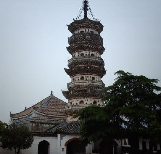 此塔为楼阁式建筑,砖木结构,现塔分7层,高达9丈。每层有四站相对,两虚两实,有阶梯可逐层登顶。每层外廊均砌有80百米高的砖栏环围,塔外壁镂有砖质佛像近千尊。塔底层南窦,原龛置一尊李常塑的僧璨舍利像。于“文化大革命”中被毁,今重新供置近年塑制的三祖僧璨像。塔中尚存明嘉清三十四年(1555年)寺僧了莹修复时所立碑纪。塔顶相轮高1.5丈,为宋乾道八年(1172年)所立,有相轮九节,上为葫芦形铁圈,下为壶形宝瓶,瓶颈部有佛家咒语四行。中间五节如轮镂有几何花纹。底部相轮似锅反扣,上铸铭文170字,记载了舒州怀宁县玉照乡(今潜山县梅城一带)佛教徒黄氏及胡仲明舍铁铸塔顶之事。塔顶相轮以一木柱串起,直立在塔的上部,八条铁练由塔顶系向八方,上系串串挂铃,微风吹过,叮当作响,十分悦耳动听。据《潜山志》载:“塔上莓苔不生,鸟雀不栖,每年都有龙来洗塔。到时,雷电晦螟,风雨交加,腥风扑鼻,令人生怖”此载虽属荒诞,但登临塔顶,凭栏远眺,但见三祖山上万木稠环,浓郁苍翠;三祖山下清泉潺湲,千花竞艳,古刹深藏,隐隐似凤项坠玉;塔影雄峙,丽丽如彩云浮空,气象万千,确也美不胜收。