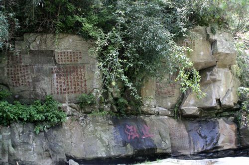 位于三祖寺右下方山涧处。这里山谷流泉,曲径通幽,内有石牛古洞,石如牛眠,周围环崖如洞,幽泉潺潺,石泉周围和石壁上存有唐、宋、明、清历代达官名宦、文人墨客的诗文摩崖石刻三百多处。其中最早的一为唐文学家李翱题刻,一为唐三州刺史李德修题刻;宋朝题刻有一百幅,以王安石、李师中、苏东坡、黄庭坚等刻记最为著名,内容直接涉及三祖寺的有六幅。1981年,安徽省人民政府公布“山谷流泉摩崖石刻”为省重点文物保护单位。