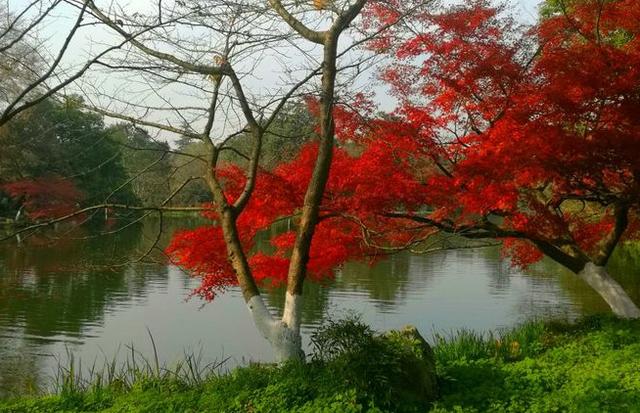 在湖岸的绿色植被中,红叶闪闪发光,引人注目。
