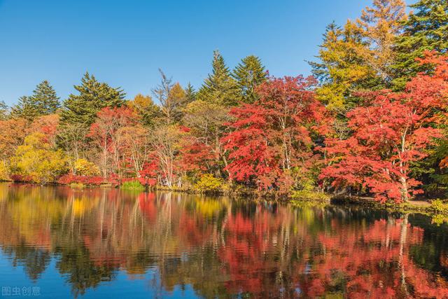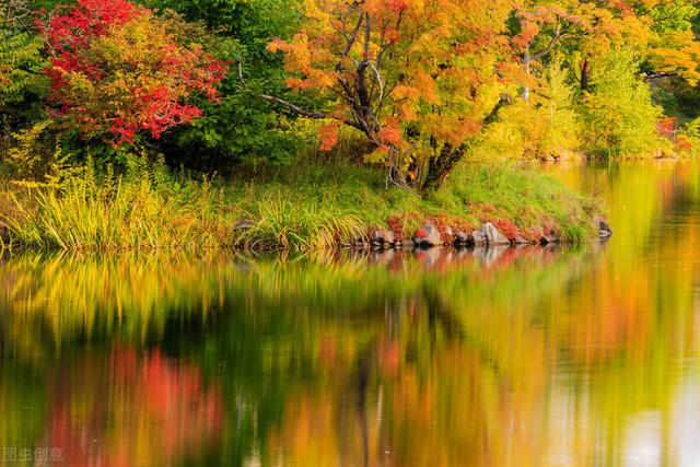 秋天景象Radiant red foliage reflects off the surface of the lake.